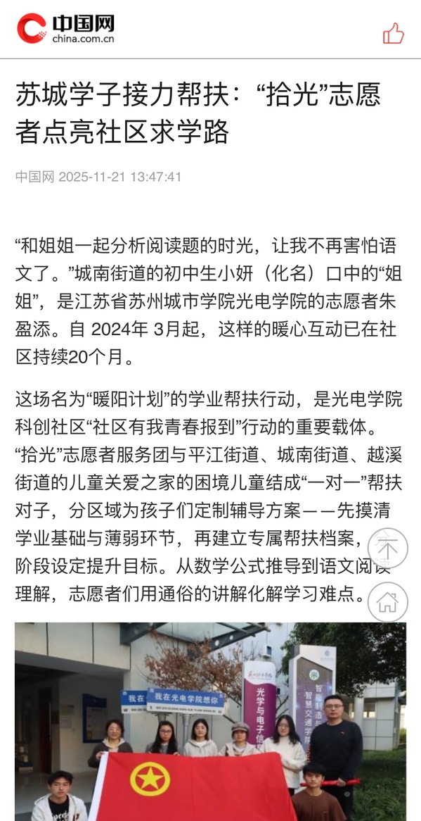“和姐姐一起分析阅读题的时光,让我不再害怕语文了。”城南街道的初中生小妍(化名)口中的“姐姐”,是江苏省苏州城市学院光电学院的志愿者朱盈添。自 2024年 3月起,这样的暖心互动已在社区持续20个月。
