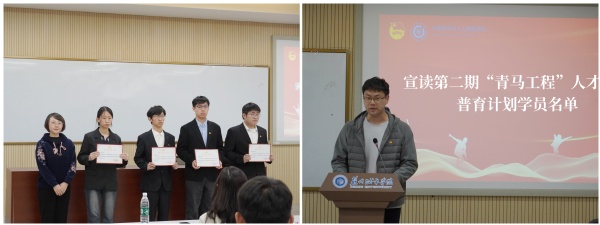 何玉为第一期“青马工程”学员代表颁发结业证书。过去一年的培训和学习,见证了第一期青马学员们阶段性成果,也预示着他们在未来将迎来更加广阔的发展空间和更加辉煌的成就。毋张明宣读第二期“青马工程”学员名单,正式确定23物联网(中外合作)2班曹根绮等58名同学开启为期一年的“青马工程”培养。