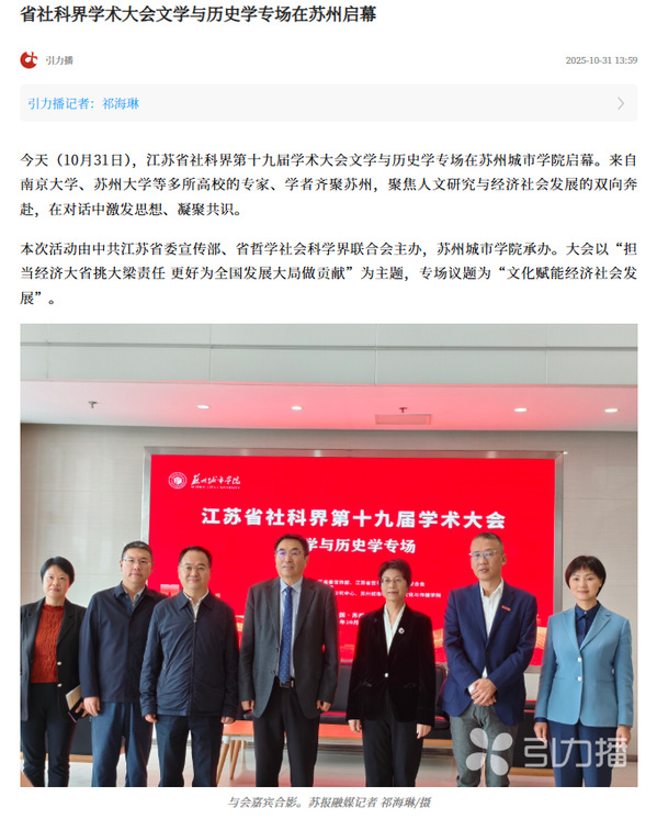 今天(10月31日),江苏省社科界第十九届学术大会文学与历史学专场在苏州城市学院启幕。来自南京大学、苏州大学等多所高校的专家、学者齐聚苏州,聚焦人文研究与经济社会发展的双向奔赴,在对话中激发思想、凝聚共识。