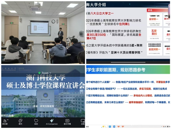 澳门科技大学线上宣讲,解锁澳门升学新选项。11月26日,澳门科技大学通过线上直播形式,向我校学生系统推介学校办学优势,从整体办学特色、高水平师资团队配置,到硕士阶段专业分类、毕业生就业竞争力,再到申请材料准备与提交流程,全方位解答学生对澳门地区升学的疑问,为学生多元化升学提供新选择。