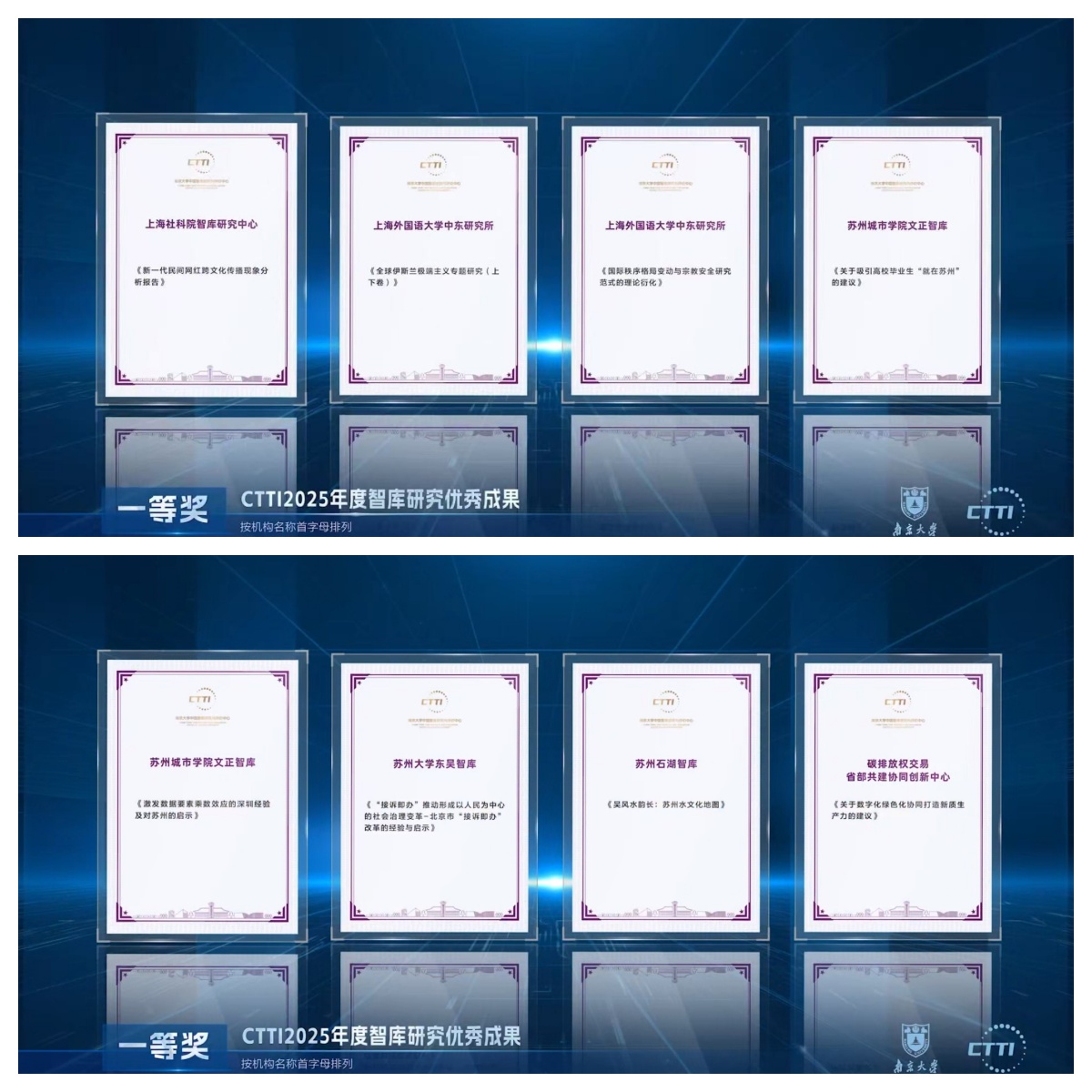 长期以来,CTTI智库研究优秀成果评选得到了全国高校、党政部门、社科院系统、企业等智库机构的热切回应、普遍认可,评选竞争激烈,组织严格规范,评选结果在国内智库研究领域具有代表性、权威性。在今年的评选中,我校高宏赋教授、黄涧秋副校长完成的决策咨询报告《关于吸引高校毕业生“就在苏州”的建议》,王青松博士、市社科院王俊院长完成的决策咨询报告《激发数据要素乘数效应的深圳经验及对苏州的启示》,在全国限项申报的1014 份参评成果中脱颖而出,均荣获一等奖。这两项决策咨询报告此前都获得了省级领导的肯定性批示。2025年11月21日,在南京举办的“2025新型智库治理论坛”上,高宏赋受邀作了题为《如何建立就业立交桥——从高校毕业生就业盲区谈起》的学术报告,引起与会者的广泛共鸣。