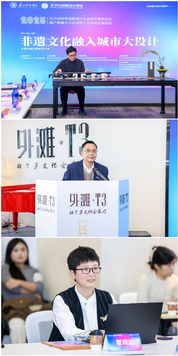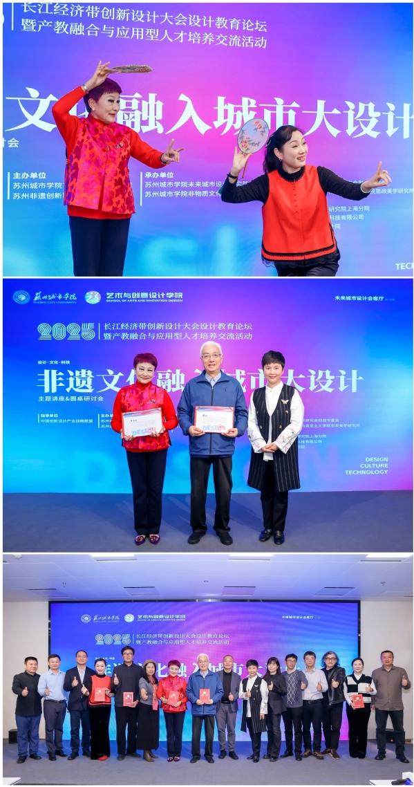 2025年12月1日下午,由苏州城市学院艺术与创意设计学院、苏州非遗创新联合体(曲艺戏剧类)联合主办,苏州城市学院未来城市设计研究院、苏州城市学院马克思主义学院思政美学研究所承办的“非遗文化与城市大设计融合”主题讲座及圆桌研讨会在上海绿地外滩中心T3-38F会议中心成功举行。论坛作为2025长江经济带创新设计大会的重要组成部分,汇聚了来自上海市城市更新研究会、东华大学、上海师范大学、设计企业及非遗传承领域的16位专家学者与实践者,围绕“非遗文化融入城市大设计”展开深度对话与跨界碰撞。