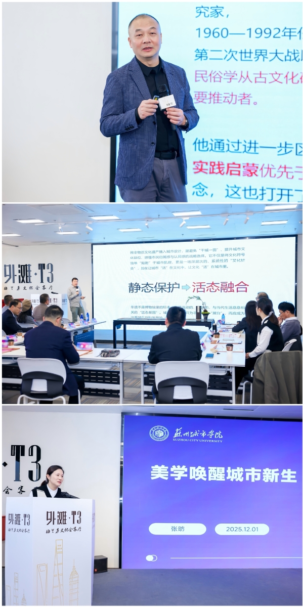 焦点三:城市空间的设计赋能。苏州阳澄湖文化研究会会长王少辉以亲身参与的“苏州御窑金砖博物馆”(普利兹克奖得主刘家琨设计)和全国首个曲艺主题公园“苏州评弹公园”为例,阐述了如何通过精巧的空间设计,让非遗精神内核可感可知,实现传统与现代的对话,并最终赋能城市品牌与社区发展。