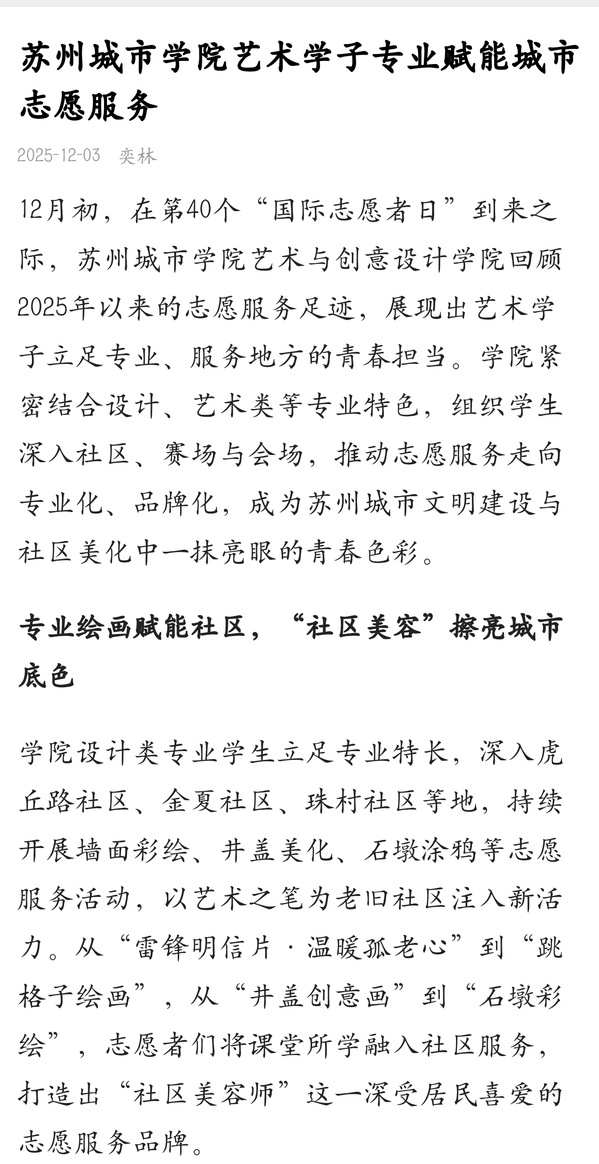 12月初,在第40个“国际志愿者日”到来之际,苏州城市学院艺术与创意设计学院回顾2025年以来的志愿服务足迹,展现出艺术学子立足专业、服务地方的青春担当。学院紧密结合设计、艺术类等专业特色,组织学生深入社区、赛场与会场,推动志愿服务走向专业化、品牌化,成为苏州城市文明建设与社区美化中一抹亮眼的青春色彩。