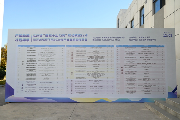 为深入贯彻江苏省关于深化校企合作、服务产业升级的最新工作部署,主动衔接全省“百校千企万岗”行动,我校于12月3日在校体育健身中心举办“产聚新质,才启华章”——江苏省“百校千企万岗”联动就业行动暨苏州城市学院2026届毕业生校园招聘会,本次招聘会由招生就业处主办,团委(美育中心)、数字经济与管理学院共同协办。