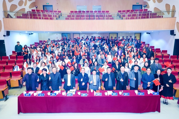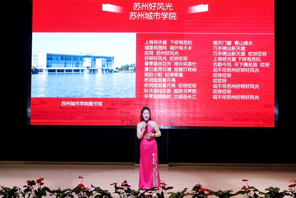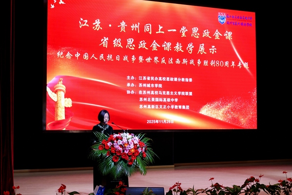 11月26日下午,苏州城市学院马克思主义学院联合苏州北美国际高级中学、在苏高校马克思主义学院联盟、苏州高新区文正小学教育集团组织开展苏·贵两地多校同上一堂思政金课省级思政金课教学展示活动。活动以纪念抗日战争暨世界反法西斯战争胜利80周年为主题,通过示范教学、讲唱结合、校际联动等形式,展示思政金课建设的创新成果,推动大中小学思政课教学一体化改革的深入发展。江苏省高校思政课教指委委员朱蓉蓉、蒋艳、葛莹莹,有关高校马克思主义学院负责人、在苏州高校思政课教师代表、苏州城市学院、苏州北美国际高级中学、文正小学教育集团等大中小学学生代表300多人参加了教学活动。