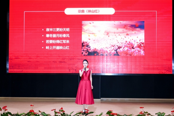 在教学展示阶段,主讲人贵阳信息科技学院校长唐建荣教授以“开天辟地、改天换地、翻天覆地、惊天动地”四大历史阶段为主脉络,创新运用“党史+音乐”教学的形式,以丰富史实和富有感染力的讲述,将百年党史中关键节点与思想精髓娓娓道来,构建起一堂“有深度、有温度、有力度”的思政示范课,生动呈现了中国共产党领导人民进行革命、建设、改革的百年奋斗历程,深刻剖析了红色旋律在不同历史时期凝聚人心、鼓舞斗志的独特价值,令现场师生深受启发。王韦韦老师以深情演唱了《映山红》《松花江上》《英雄赞歌》《唱支山歌给党听》《茉莉花》《春天的故事》《贵州恋歌》等多首红色经典曲目。王老师用高超的唱功将每首歌曲背后的红色情感娓娓道来,使在场的师生在优美的旋律中,重温了百年党史的壮阔波澜,在艺术的熏陶中接受精神洗礼。在教学展示中,苏州北美国际高级中学表演的诗朗诵、文正小学教育集团的小学生表演的舞蹈、苏州工业园区职业技术学院马克思主义学院副院长程文文老师演唱的《苏州好风光》,使教学活动高潮迭起。
