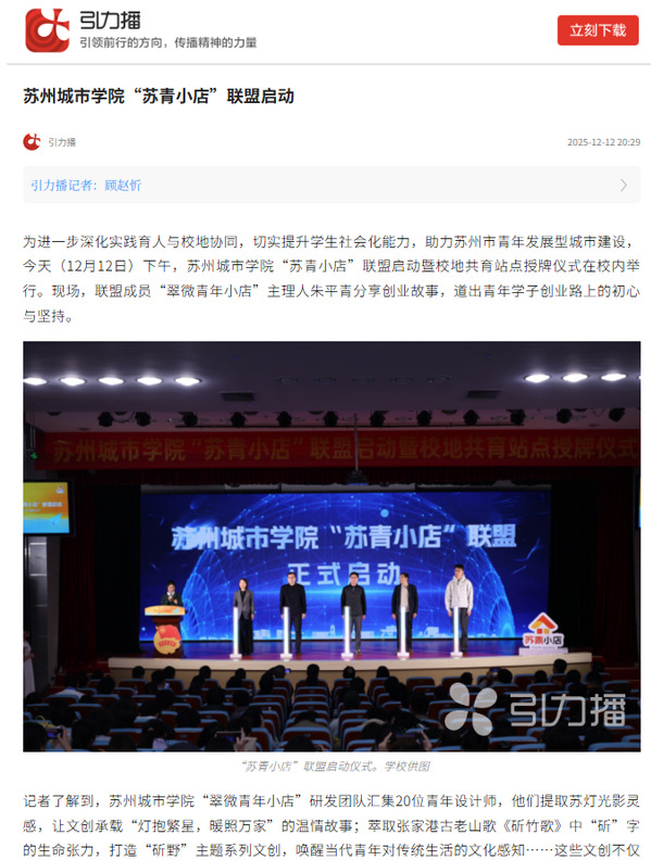 为进一步深化实践育人与校地协同,切实提升学生社会化能力,助力苏州市青年发展型城市建设,今天(12月12日)下午,苏州城市学院“苏青小店”联盟启动暨校地共育站点授牌仪式在校内举行。现场,联盟成员“翠微青年小店”主理人朱平青分享创业故事,道出青年学子创业路上的初心与坚持。