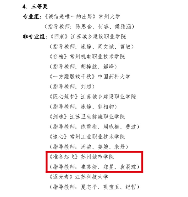 2025年5月至12月,由江苏省委宣传部、省教育厅、团省委联合主办的2025江苏省大学生戏剧展演圆满落幕。我校高度重视此项赛事,广泛动员学生参与,全程提供专业的指导与资源支持。经过省赛初赛、决赛评选,我校原创短剧《准备起飞》荣获短剧类非专业组三等奖,成功实现我校在该项赛事上零的突破。