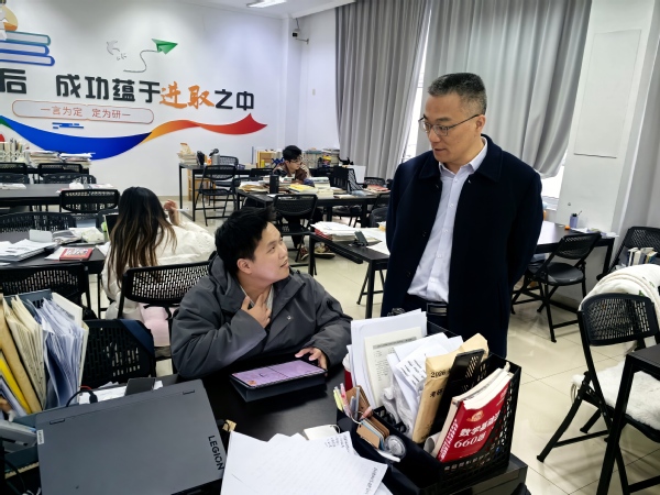 在考研自习室,检查组一行首先向正在紧张备考的学子们表达了学院的关怀。院领导详细询问了同学们的复习进展、心理状态及实际困难,叮嘱大家在冲刺阶段要科学规划、张弛有度,保持积极健康的应考心态,并特别提醒注意自习期间的个人财物与用电安全。