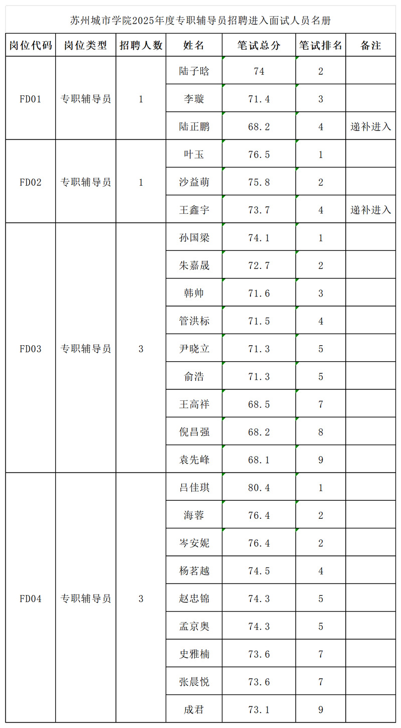 苏州城市学院2025年度专职辅导员招聘资格复审、人员递补工作已经结束,现将进入面试人员公告如下: