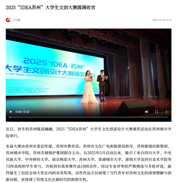 近日,初冬的苏州暖意融融,2025“IDEA苏州”大学生文化创意设计大赛颁奖活动在苏州城市学院举行。