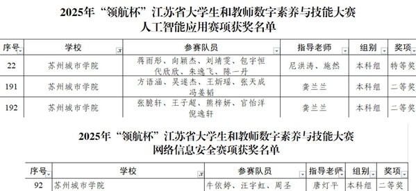近日,由江苏省教育厅、江苏省教育信息化与数据管理中心主办的2025年“领航杯”江苏省大学生和教师数字素养与技能大赛在南京邮电大学圆满落幕。我校计算科学与人工智能学院学子在教师的悉心指导下奋勇拼搏、锐意创新,共斩获本科组特等奖1项、二等奖3项,实现学院在该赛事中的历史性突破。