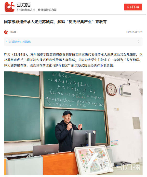 昨天(12月4日),苏州城市学院邀请碧螺春制作技艺国家级代表性传承人施跃文及其女儿施影,以及苏州市虎丘三花茶制作技艺代表性传承人唐华军,共同为大学生们带来了一场题为“长江沿岸、环太湖碧螺春茶、虎丘三花茶文化与制作技艺”的沉浸式历史经典产业非遗课。