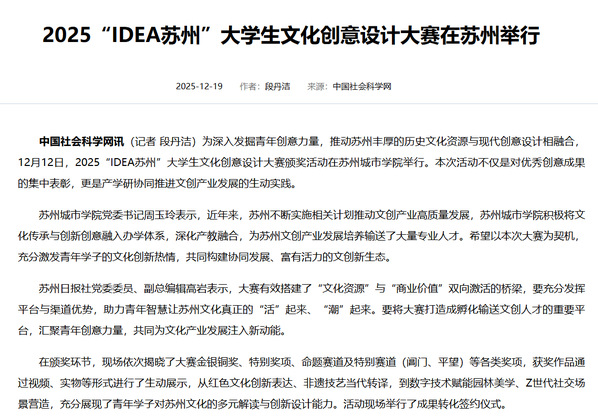 为深入发掘青年创意力量,推动苏州丰厚的历史文化资源与现代创意设计相融合,12月12日,2025“IDEA苏州”大学生文化创意设计大赛颁奖活动在苏州城市学院举行。本次活动不仅是对优秀创意成果的集中表彰,更是产学研协同推进文创产业发展的生动实践。