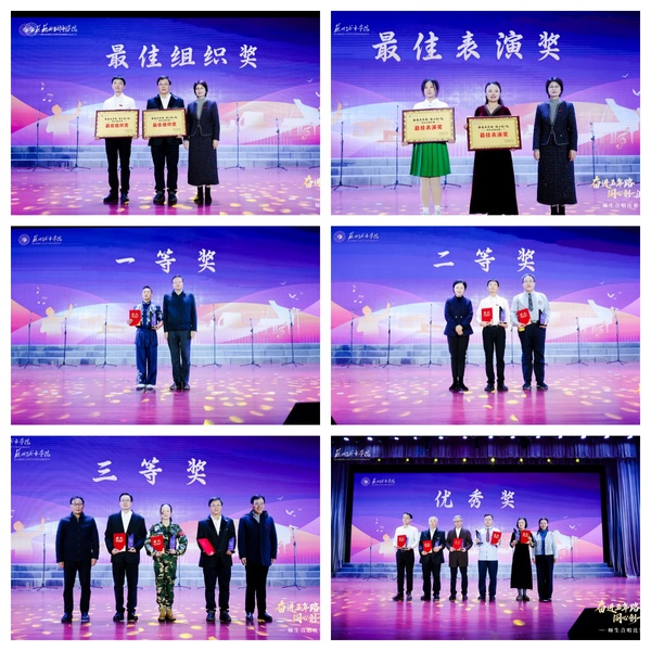 经过激烈角逐与评委们的专业评审,比赛最终评选出一等奖1名、二等奖2名、三等奖3名、优秀奖5名,同时颁发最佳组织奖与最佳表演奖各2名。其中基础教学部荣获一等奖,智能制造与智慧交通学院、艺术与创意设计学院荣获二等奖,光学与电子信息学院、机关1队、数字经济与管理学院荣获三等奖,计算科学与人工智能学院、城市文化与传播学院、城市治理与公共事务学院、马克思主义学院、机关2队荣获优秀奖,机关党委、艺术与创意设计学院荣获最佳组织奖,教工合唱团、大学生合唱团荣获最佳表演奖。颁奖环节中,校领导依次为获奖队伍和单位颁奖,台下掌声不断,共同见证荣耀时刻,定格师生们的奋斗荣光。