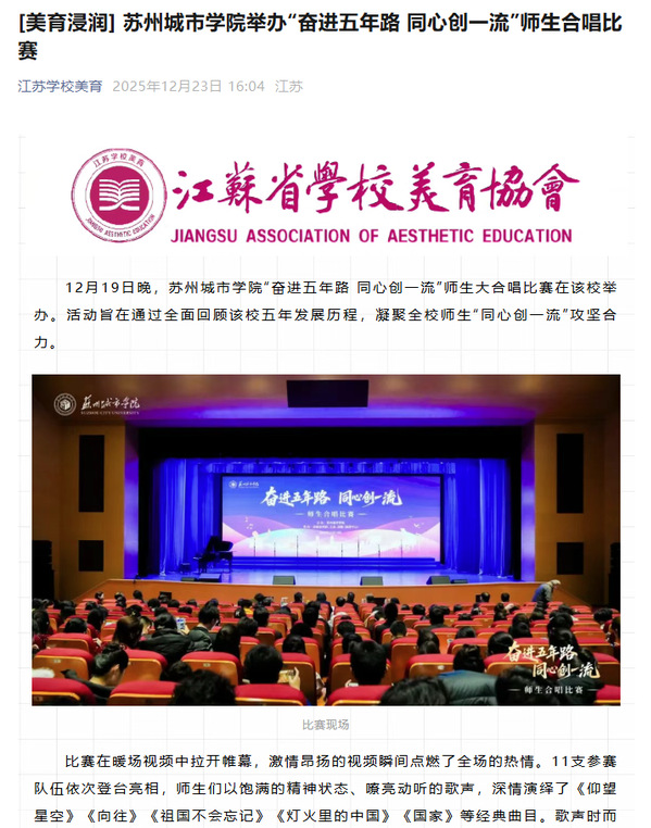 12月19日晚,苏州城市学院“奋进五年路 同心创一流”师生大合唱比赛在该校举办。活动旨在通过全面回顾该校五年发展历程,凝聚全校师生“同心创一流”攻坚合力。