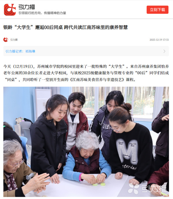 今天(12月19日),苏州城市学院的校园里迎来了一批特殊的“大学生”。来自苏州康养集团怡养老年公寓的30余位长者走进大学校园,与该校2025级健康服务与管理专业的“00后”同学们结成“同桌”,共同聆听了一堂别开生面的《江南苏味美食营养与非遗技艺》课程。