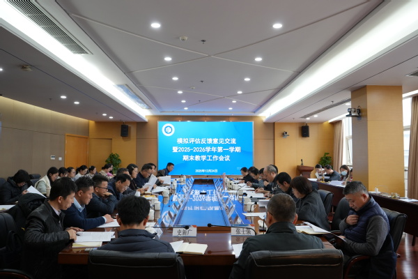 为全面梳理模拟评估反馈意见,统筹部署期末教学管理重点工作,确保本学期各项教育教学任务圆满收尾,12月24日下午,我校在综合楼大会议室召开模拟评估反馈意见交流暨2025-2026学年第一学期期末教学工作会议。副校长高雷,教务处处长许宜申、党委学生工作部(学生工作处、人民武装部)副部长(处长)祁素萍、教学质量管理与评估处陈书洋,各学院(部)主要负责同志、分管教学负责同志等人员参加会议。会议由教务处处长许宜申主持。