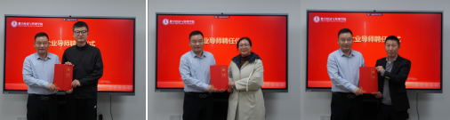 签约仪式后,我院正式聘任杨阳、张小琴、刘孝军三位企业专家为数字经济与管理学院的企业导师,王文华分别向三位企业导师颁发聘书。