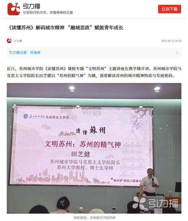 近日,苏州城市学院《读懂苏州》课程专题“文明苏州”主题讲座在教学楼开讲。苏州城市学院马克思主义学院院长田芝健以“苏州的精气神”为题,深度解读苏州的城市精神特质与发展密码。