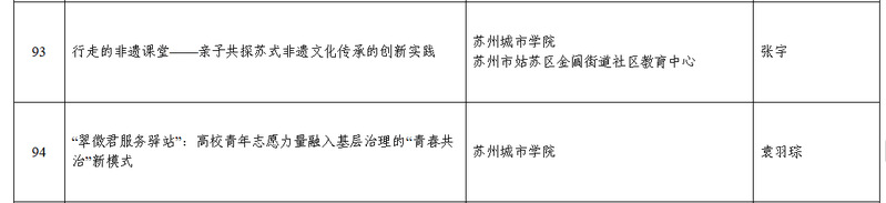 近日,江苏省教育厅发布学习型社区建设案例和课程推介通知,我校申报的《“翠微君服务驿站”:高校青年志愿力量融入基层治理的“青春共治”新模式》,以及与姑苏区金阊街道社区教育中心联合申报的《行走的非遗课堂——亲子共探苏式非遗文化传承的创新实践》均获推介,并在“江苏学习在线”等省级平台发布。