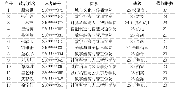 2025年第四季度“阅读之星”评选活动已圆满结束,以图书馆借阅系统统计记录的2025年10月1日~12月31日期间有效借阅总量排名为依据(排除即时借还读者),对借阅量排名前13名学生授予季度“阅读之星”荣誉称号。具体获奖名单如下: