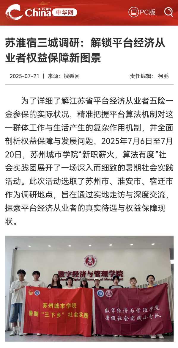 为详细了解江苏省平台经济从业者社会保险参保的实际状况,精准把握平台算法机制对这一群体工作与生活产生的影响作用,全面剖析权益保障与发展问题,2025年7月6日至7月20日,苏州城市学院“新职薪火,算法有度”暑期实践团开展了一次意义深远的暑期社会实践活动。此次活动选取了苏州市、淮安市、宿迁市作为调研地点,旨在通过实地走访与深度交流,探索平台经济从业者的真实待遇与权益保障现状。