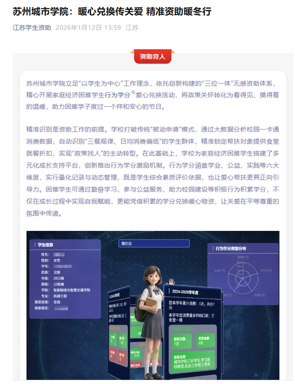 近年来,苏州城市学院持续深化资助育人改革,构建起“保障型资助兜底、发展型资助赋能、多渠道暖心活动添温”的三位一体无感资助体系。在保障型资助层面,学校为困难学生开通8折无感支付功能,为极困学生推出全年免费用餐计划,新生“绿色通道”畅通无阻,全方位筑牢精准兜底防线;在发展型资助层面,除行为学分激励机制外,学校还通过奖助学金、勤工助学岗位、学业辅导等多种举措,助力困难学子提升综合能力;在暖心活动层面,结合重要节点开展走访慰问、返乡路费补助、节日关怀等活动,让资助既有力度更有温度。