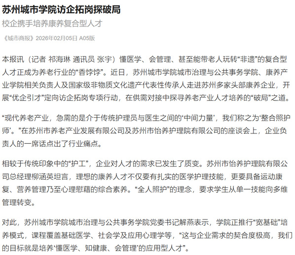 懂医学、会管理、甚至能带老人玩转“非遗”的复合型人才正成为养老行业的“香饽饽”。近日,苏州城市学院城市治理与公共事务学院、康养产业学院相关负责人及国家级非物质文化遗产代表性传承人走进苏州多家头部康养企业,开展“优企引才”定向访企拓岗专项行动,在供需对接中探寻养老产业人才培养的“破局”之道。