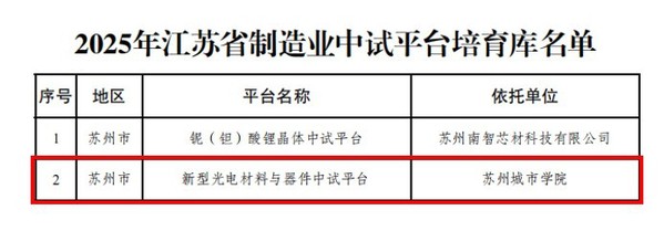 近日,江苏省工业和信息化厅正式印发《2025年江苏省制造业中试平台培育库名单》,我校申报的“新型光电材料与器件中试平台”成功入选,这是我校首次入选该省级培育库。这一成果标志着学校在“基础研究-概念验证-中试转化-产业赋能”全链条创新体系建设中取得关键突破,进一步巩固了学校在服务区域产业创新、推动科技成果转化中的核心地位。