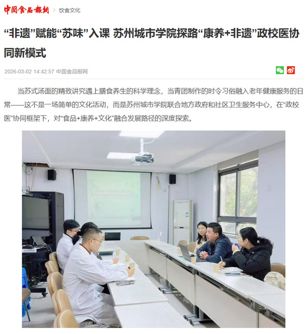 当苏式汤面的精致讲究遇上膳食养生的科学理念,当青团制作的时令习俗融入老年健康服务的日常——这不是一场简单的文化活动,而是苏州城市学院联合地方政府和社区卫生服务中心,在“政校医”协同框架下,对“食品+康养+文化”融合发展路径的深度探索。