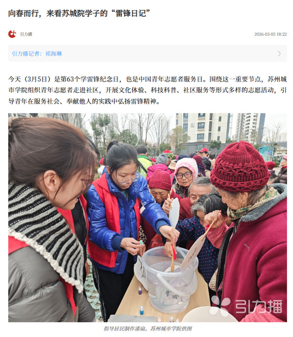 3月5日是第63个学雷锋纪念日,也是中国青年志愿者服务日。围绕这一重要节点,苏州城市学院组织青年志愿者走进社区,开展文化体验、科技科普、社区服务等形式多样的志愿活动,引导青年在服务社会、奉献他人的实践中弘扬雷锋精神。