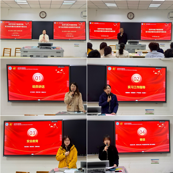 为切实落实毕业实习教学任务,筑牢实习安全防线,明确实习管理要求,3月16日下午光学与电子信息学院2026届毕业实习动员暨安全教育开班仪式在学校5号教学楼202教室顺利召开。学院党委书记宋丹、院长雎胜、产教融合负责人左青卉、光电信息科学与工程专业负责人吴丹、微电子科学与工程专业负责人魏苗清、团学工作办公室主任郭浩、年级辅导员罗雨虹及2025-2026学年第二学期参加学院集中实习的学生参加开班仪式,开班仪式由学院教学与科研办公室陈玥妤主持。