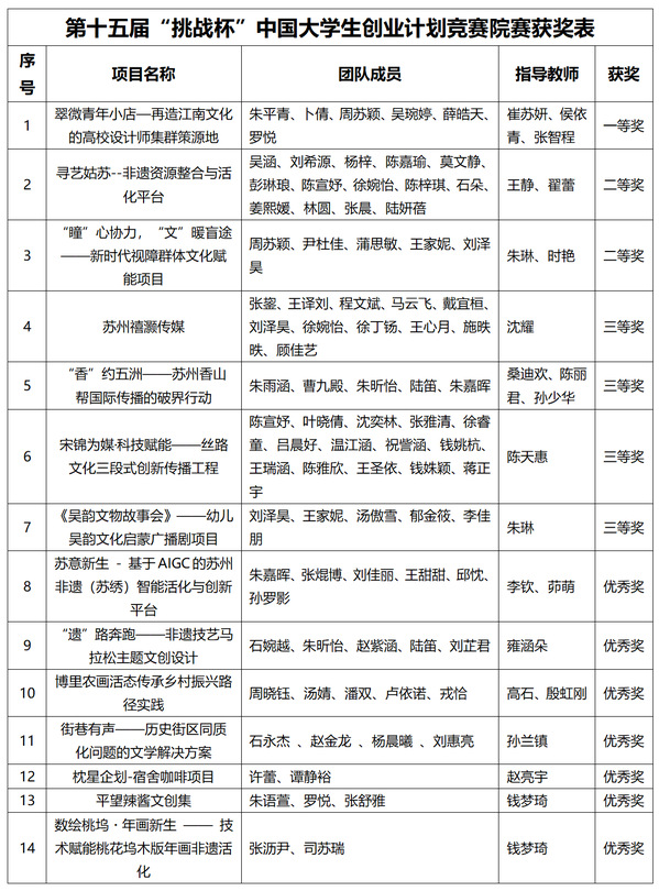 经过激烈角逐,最终《翠微青年小店——再造江南文化的高校设计师集群策源地》项目荣获本次大赛一等奖;《寻艺姑苏--非遗资源整合与活化平台》和《“瞳”心协力,“文”暖盲途——新时代视障群体文化赋能项目》项目荣获本次大赛二等奖;《苏州禧灏传媒》《“香”约五洲——苏州香山帮国际传播的破界行动》《宋锦为媒·科技赋能——丝路文化三段式创新传播工程》项目荣获本次大赛三等奖。