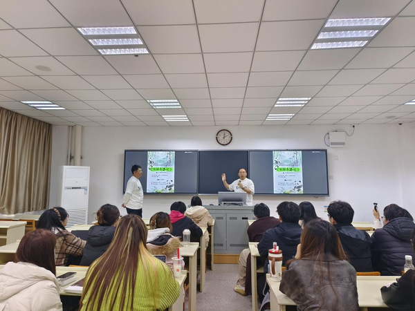 活动伊始,《熊猫奇遇记》主创杨懿丁、张晋两位导演与播音专业的同学们围坐交流,分享影片从拍摄到制作的幕后故事。在交流过程中,两位导演结合纪录片的叙事节奏、情感表达与声音呈现,为学生们详细讲解了语言表达、画面适配、纪实类作品配音创作等实用经验,让大家在真实案例中理解“用声音传递真实、用讲述守护温度”这一专业理念的内涵。
