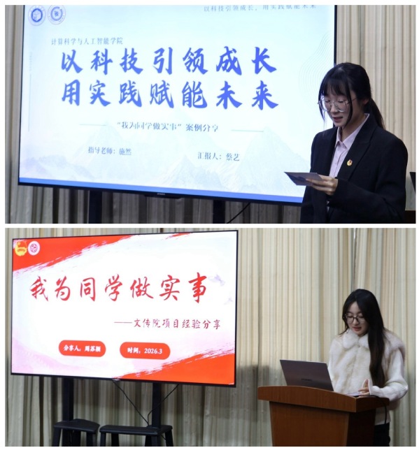 在全国高校学生会组织“我为同学做实事”启航季服务项目网络巡展活动中,我校3个项目从1662个项目中脱颖而出,入选全国代表性实践案例。会上,城市文化与传播学院学生会、计算科学与人工智能学院学生会代表结合入选项目,分享了服务同学的创新实践与特色成果。文传学院学生会立足苏州地域文化优势,分别聚焦非遗传承与就业服务两个领域,打造兼具文化底蕴与实用价值的服务品牌,精准对接学生多元需求。计科学院学生会聚焦新生适应痛点,构建“科技—实践—情感”三维赋能模式,通过科创迎新、文化科技融合实践、阶梯化竞赛培育等举措,切实帮助新生缩短适应周期、建立专业认同、激发学术兴趣。