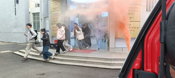 下午4时15分,随着消防警报声在综合实验楼下准时响起,模拟烟雾同步释放,疏散演练正式开始。在实验室教师和引导员的指挥下,同学们迅速反应,按照预定路线,用手或衣物捂住口鼻,弯腰低姿,快速有序地从各实验室撤离至楼外安全区域。整个疏散过程流程顺畅、组织有序,圆满达成预期演练目标。