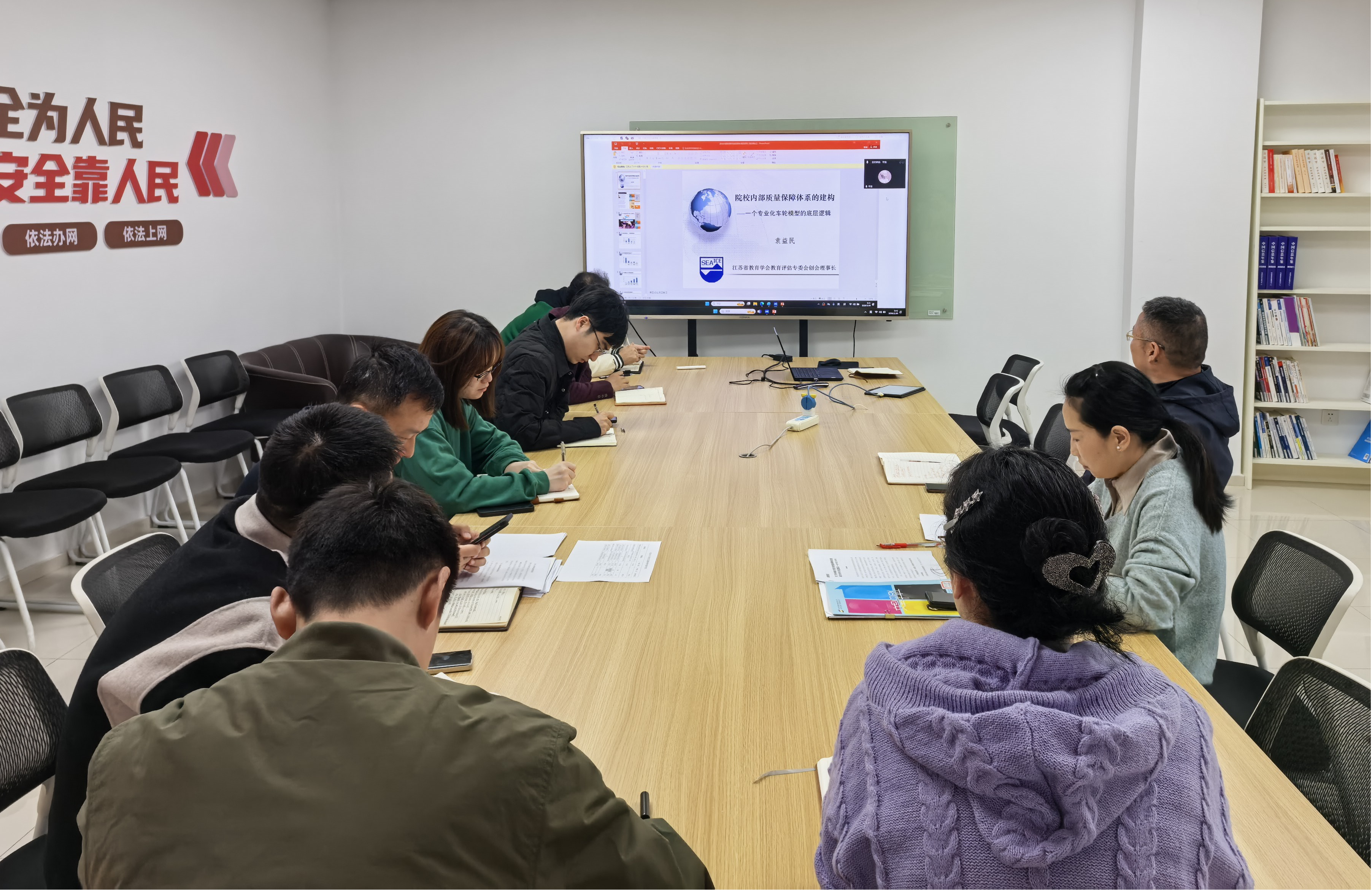 为进一步提升内部质量保障体系建设水平,3月30日上午,教学质量管理与评估处组织召开“教学质量保障体系构建与运行机制优化培训会”。江苏省教育厅原政策法规处一级调研员袁益民应邀担任主讲,教学质量管理与评估处及评建工作专班全体人员参加培训。