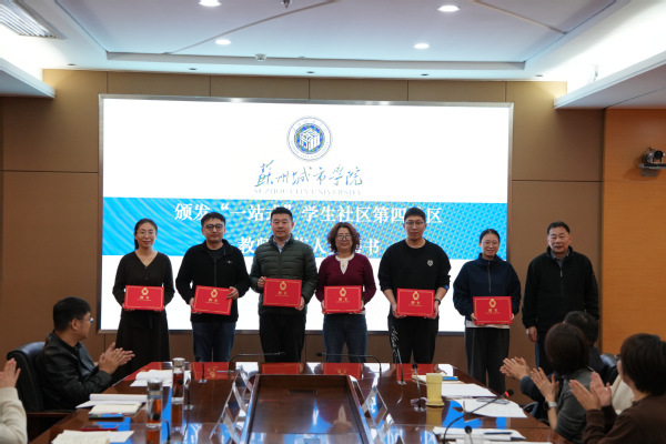 会议伊始,党委学生工作部(学生工作处)张鹏远汇报2025年学校“一站式”学生社区建设推进情况。祁素萍宣读第四社区教师工作人员名单,吴昌政与第四社区社区长、城市治理与公共事务学院党委书记解燕共同为社区揭牌,并向第四社区教师工作人员发放聘书。
