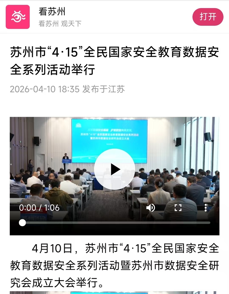 4月10日,苏州市“4·15”全民国家安全教育数据安全系列活动暨苏州市数据安全研究会成立大会举行。