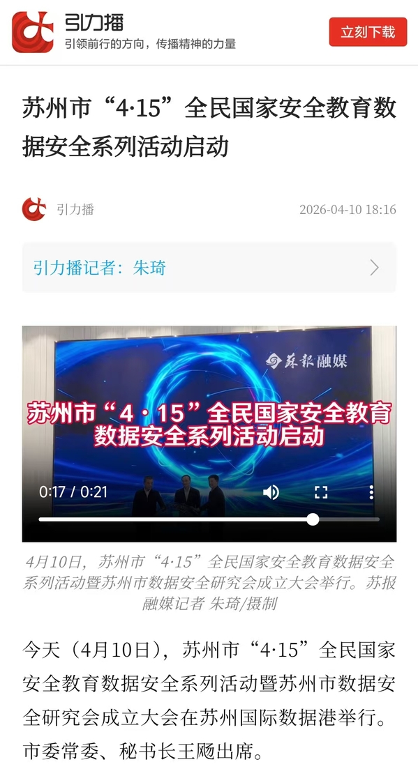今天(4月10日),苏州市“4·15”全民国家安全教育数据安全系列活动暨苏州市数据安全研究会成立大会在苏州国际数据港举行。市委常委、秘书长王飏出席。