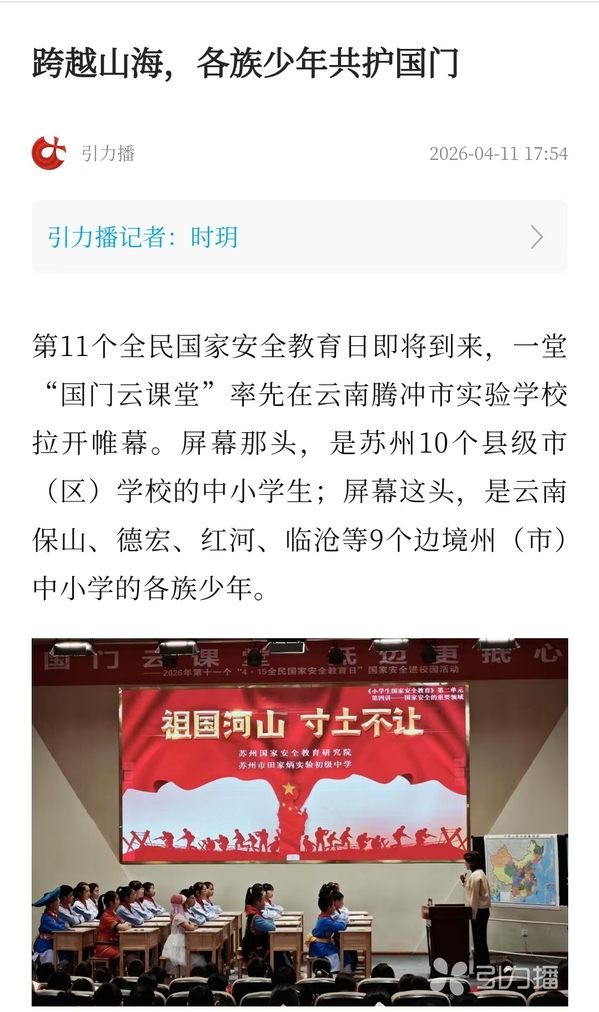 第11个全民国家安全教育日即将到来,一堂“国门云课堂”率先在云南腾冲市实验学校拉开帷幕。屏幕那头,是苏州10个县级市(区)学校的中小学生;屏幕这头,是云南保山、德宏、红河、临沧等9个边境州(市)中小学的各族少年。