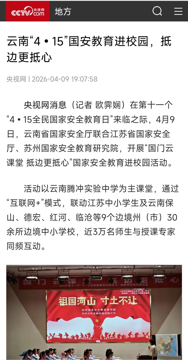 在第十一个“4•15全民国家安全教育日”来临之际,4月9日,云南省国家安全厅联合江苏省国家安全厅、苏州国家安全教育研究院,开展“国门云课堂 抵边更抵心”国家安全教育进校园活动。