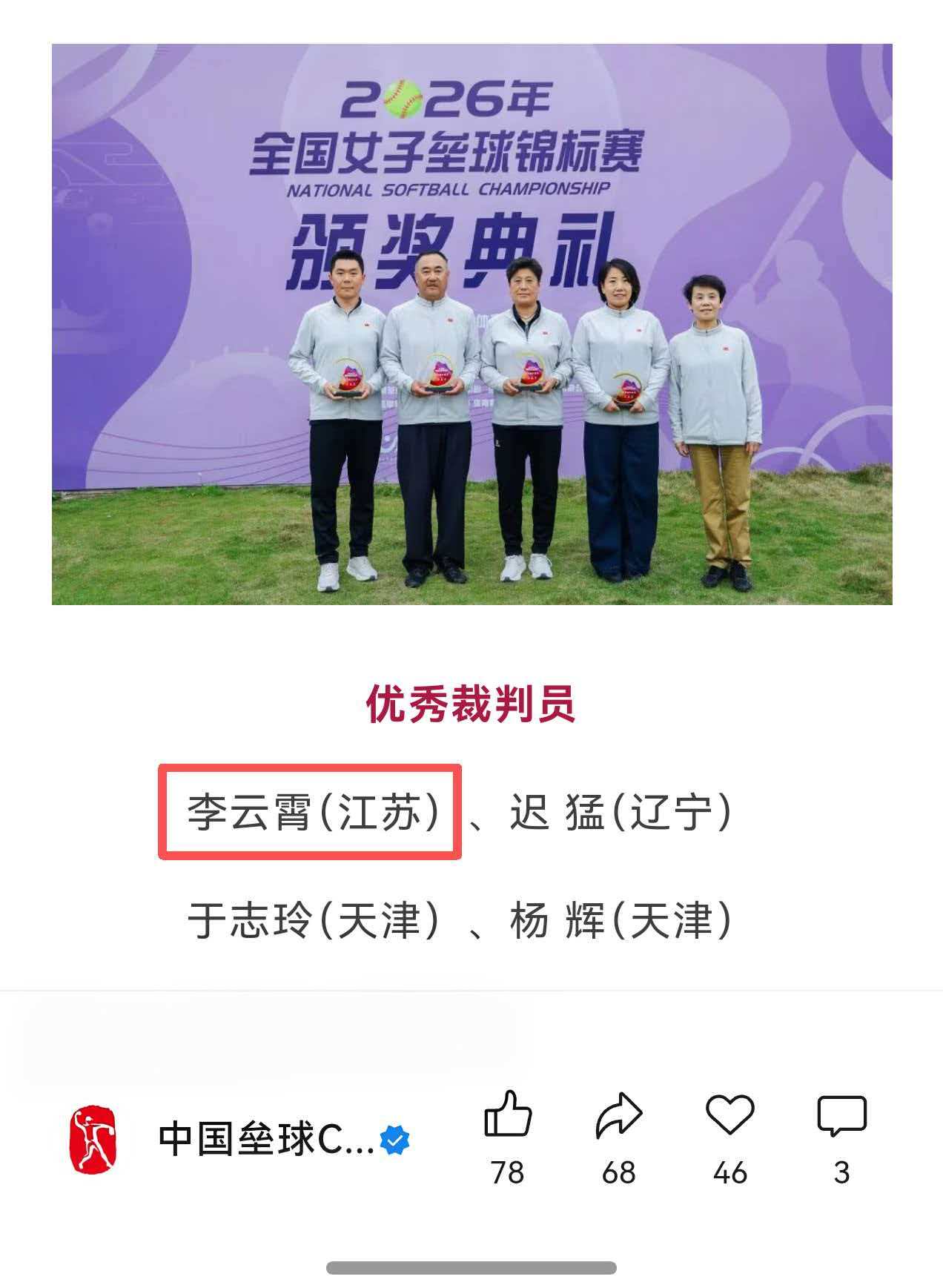 近日,2026年全国女子垒球锦标赛圆满落幕。受国家体育总局选派,苏州城市学院基础教学部教师、垒球国际级裁判李云霄凭借精湛的业务功底与严谨的执裁风范,圆满完成赛事技术官员任务,并荣获“优秀裁判员”称号。