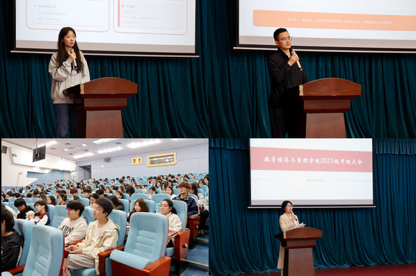 为进一步强化学风建设,引导2025级学生科学规划大学生涯,4月14日晚,数字经济与管理学院于学术报告厅召开2025级年级大会。学院团学工作办公室辅导员薛文胜、沈晓彤、吕佳琪出席会议,2025级全体学生参加会议。