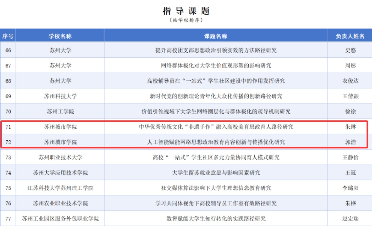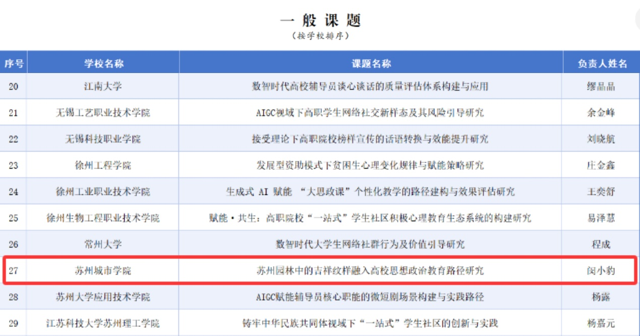 闵小豹老师报送的研究课题《苏州园林中的吉祥纹样融入高校思想政治教育路径研究》在2025年江苏省高等教育学会辅导员工作研究委员会专项课题遴选中入选一般课题;朱琳老师报送的《中华优秀传统文化“非遗手作”融入高校美育思政育人路径研究》、郭浩老师报送的《人工智能赋能网络思想政治教育内容创新与传播优化研究》入选指导课题。