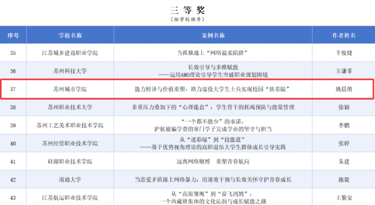姚晨朗老师报送的工作案例《能力转译与价值重塑:助力退役大学生士兵实现校园“软着陆”》在2025年江苏省高等教育学会辅导员工作研究委员会辅导员工作案例遴选中获评三等奖。