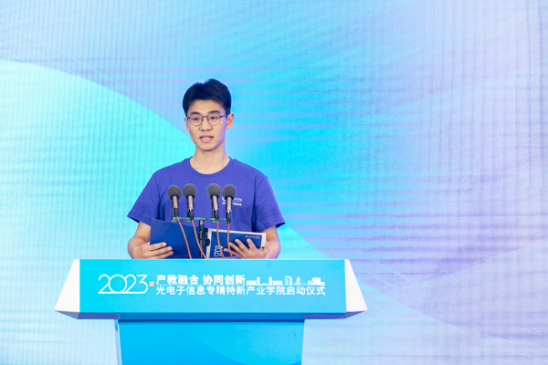 我校光电学院20级新能源材料与器件专业闫博硕同学作为学生代表发言。他表示,由工信部立项建设的光电子信息“专精特新”产业学院正式启动,这是学校人才培养模式的创新,是政﹣行﹣校﹣企合作模式的系统性升级,开启了应用型人才培养的新篇章,对于全体在校学生是一个好消息。作为苏州城市学院的一名学生,将珍惜机会,依托产业学院平台,努力学习专业文化知识,提升实践能力,成为社会需要的高素质应用型人才;主动选择在苏就业,努力服务苏州地区经济社会发展,为建设社会主义现代化强市贡献青春力量。