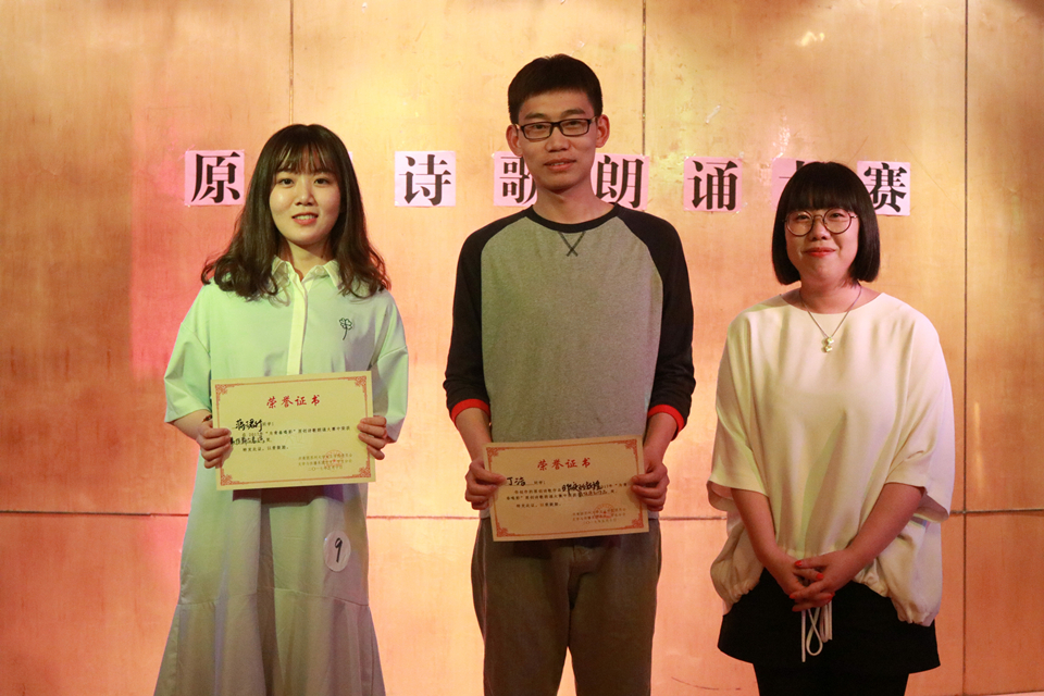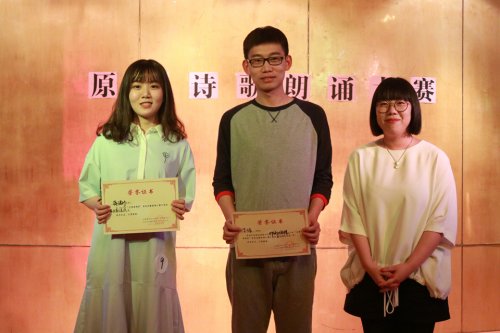 经评审,16新闻林洁创作、16新闻蒋珺竹朗诵的作品《我喜欢你,青春》斩获一等奖。16汉语言孙雪创作、16国贸王珏珏朗诵的作品《中国少年》,16汉语言仇杨创作、15法学代姝朗诵的作品《与你,不止遇见》,16汉语言丁杰创作、16机电戴毅朗诵的作品《昨夜的敦煌》获得二等奖。15外汉谢林创作、朗诵的作品《组词》,15国贸刘娜娜创作、朗诵的作品《呢喃》,16环境设计朱子涵创作、朗诵的作品《青春的模样》,16电气张庭鑫创作、16汉语言张楠楠朗诵的作品《水汽》,14外汉詹三霞创作、朗诵的作品《想你的时候就想写诗》获得三等奖。此外,本次大赛还单设了最佳原创作品奖和最佳舞台表演奖,分别由16汉语言丁杰和16新闻蒋珺竹斩获。
